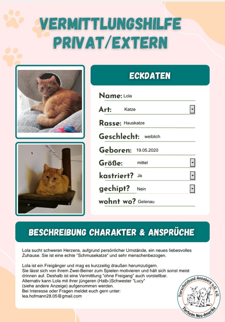 Lola Beitrags-Autor:S. Mueller Beitrag veröffentlicht:26. September 2025 Beitrags-Kategorie:Katzen Beitrags-Kommentare:0 Kommentare Das könnte dir auch gefallen Xalena 14. Mai 2025 Ilari, Iwana, Ilena, Isra 17. August 2025