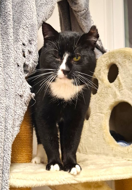 Sein Zustand war nicht gut und er wird eine Trübung am rechten Auge behalten. Dies beeinträchtigt ihn aber nicht. Der stattliche Kerl, den man eigentlich für einen „wilden“ Kater hielt, überzeugte uns schnell vom Gegenteil. Er ist definitiv einmal Menschen gewöhnt gewesen und schmust und köpfelt sehr gerne mit seinen Menschen. Sein ausgeglichenes angenehmes Wesen bezaubert uns hier alle, trotzdem ist er ein charakterstarker Kater.